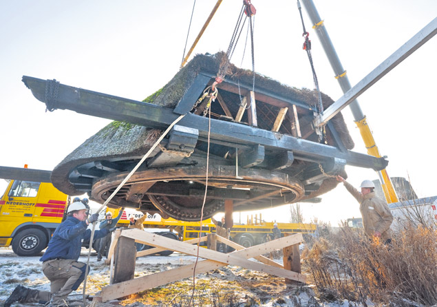 Medewerkers van kraanbedrijf Nederhoff uit Gouda-Vianen hijsen de kap van de molen uit de Dorpspolder bij Wadenoijen op een bok.