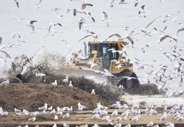 Meeuwen storten zich in Scheveningen krijsend op het voedselrijke zand waarmee bulldozers van de combinatie Van Oord/Boskalis het strand met 40 tot 70 meter verbreden.