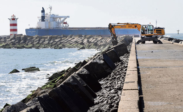 Een werknemer van Ballast Nedam treft voorbereidingen voor schadeherstel aan de noordpier van de monding van het Noordzeekanaal.