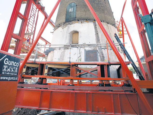 De 250 ton wegende korenmolen Nooit Gedacht in Spijkenisse is door Strukton Infratechnieken met 7 meter opgevijzeld.