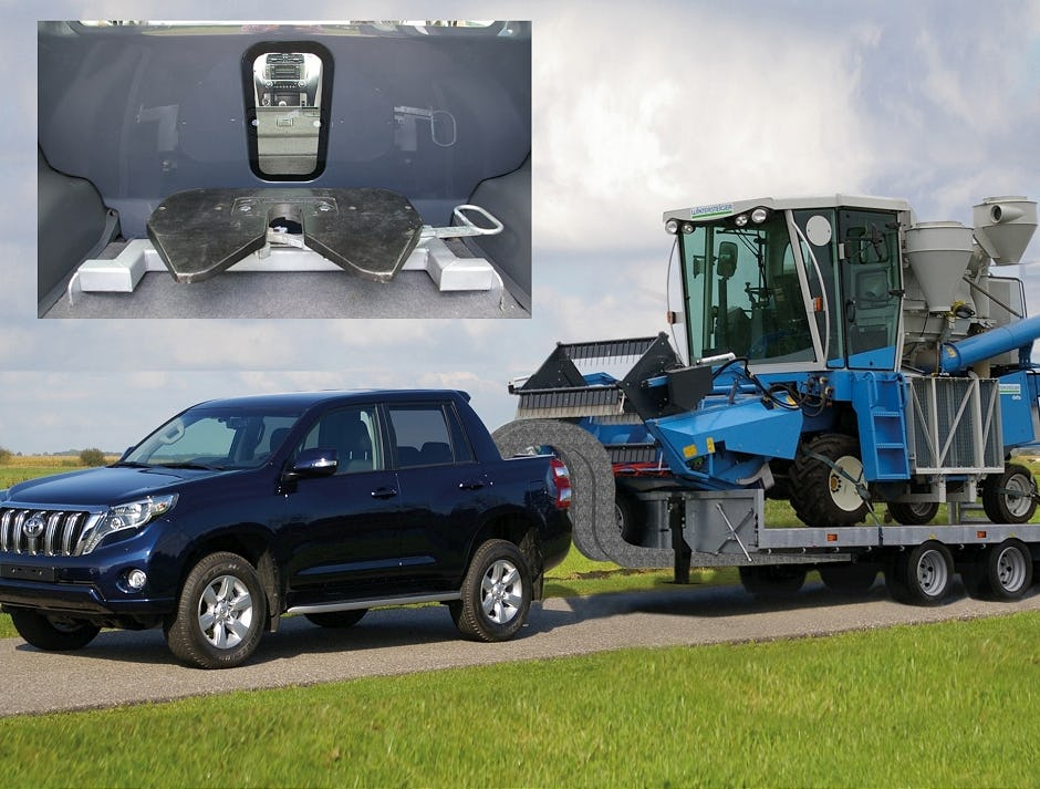 Op de foto een LC 150 trekker waarvan de oplegger is gekoppeld via de 'Gooseneck' van Veldhuizen. Inzet: de koppelplaat in de achterbak van de trekauto. De oplegger naar Amerikaans model is vooral bedoeld voor mensen die normaal in een terreinwagen rijden en maar een aantal weken in een jaar een oplegger nodig hebben, zo