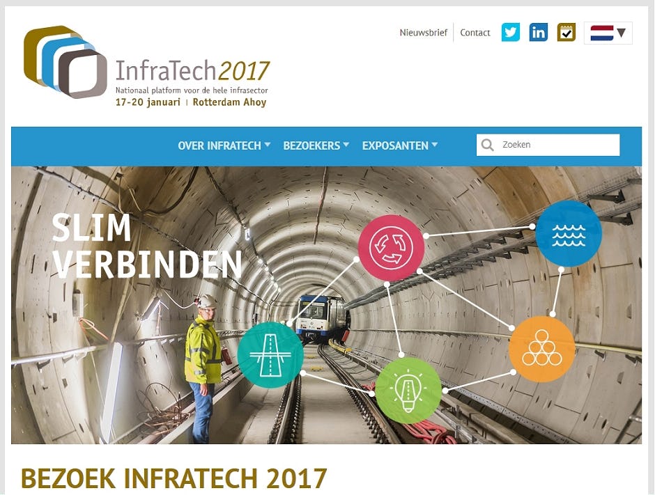 Van 17 t/m 20 januari 2017 staan in Rotterdam Ahoy de schijnwerpers weer gericht op grond-, weg- en waterbouw tijdens de vakbeurs InfraTech 2017. Met circa 550 exposanten en ruim 20.000 bezoekers is InfraTech een belangrijke beurs voor opdrachtgevers, opdrachtnemers en toeleveranciers in de Nederlandse infrastructuur. Diverse toonaangevende brancheorganisaties leveren een belangrijke bijdrage aan het