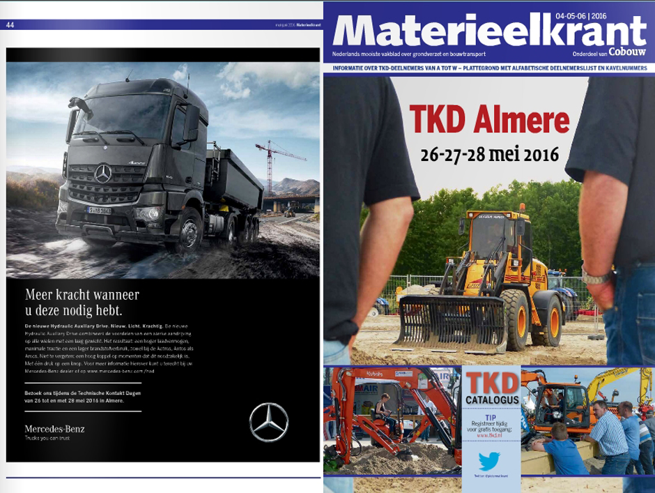 Ga voor de online editie van de TKD-catalogus naar: http://bit.ly/1TgB68h. Wie de TKD-catalogus liever downloadt om hem offline te kunnen lezen gaat naar: http://www.cobouw.nl/thema/1600496-materieel en klikt daar in de rechterkolom onder het plaatje op "Lees de Materieelkrant". De directe downloadlink is: http://bit.ly/1NyetQ2. Eind mei in Almere De TKD brengt grote en kleine spelers op het