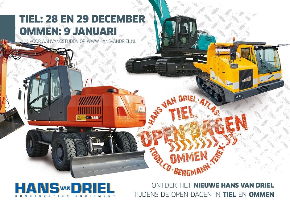 Direct na de Kerstdagen, op maandag 28 en dinsdag 29 december, is het terrein van Hans van Driel Construction Equipment het toneel voor tal van introducties en noviteiten. Op zaterdag 9 januari houdt het bedrijf ook een Open Dag op de vernieuwde vestiging in Ommen. De openingstijden in Tiel zijn: Maandag 28 december van 09.00