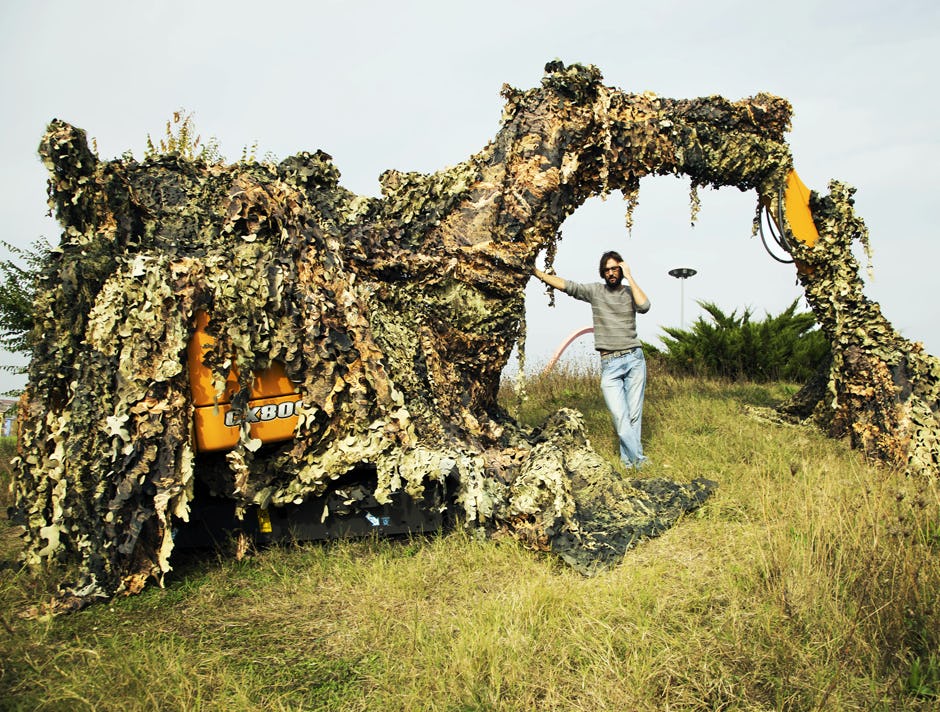 Is het een hond of paard wellicht dat hier wordt uitgebeeld? Het is in ieder geval een Case CX80C graafmachine op rups daar onder die camouflage. De in Noord-Italië gevestigde machinefabrikant Case heeft de machine uitgeleend aan een jonge kunstenaar, Hilario Isola, om er tijdens kunstfair Artissima 2016 een kunstwerk mee te maken. De titel