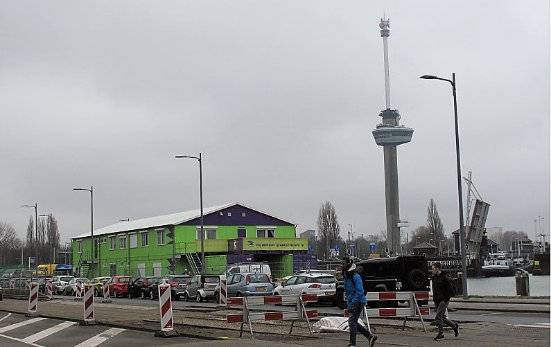 De bouwkeet staat in het Rotterdamse Crooswijk. Hier bouwt woningcorporatie Woonstad Rotterdam samen met Riz Bouw uit IJsselstein 43 nieuwe stadstuinwoningen bouwt. Het is een plek tussen stad en groen, aan de rand van een oud Rotterdams stadspark.