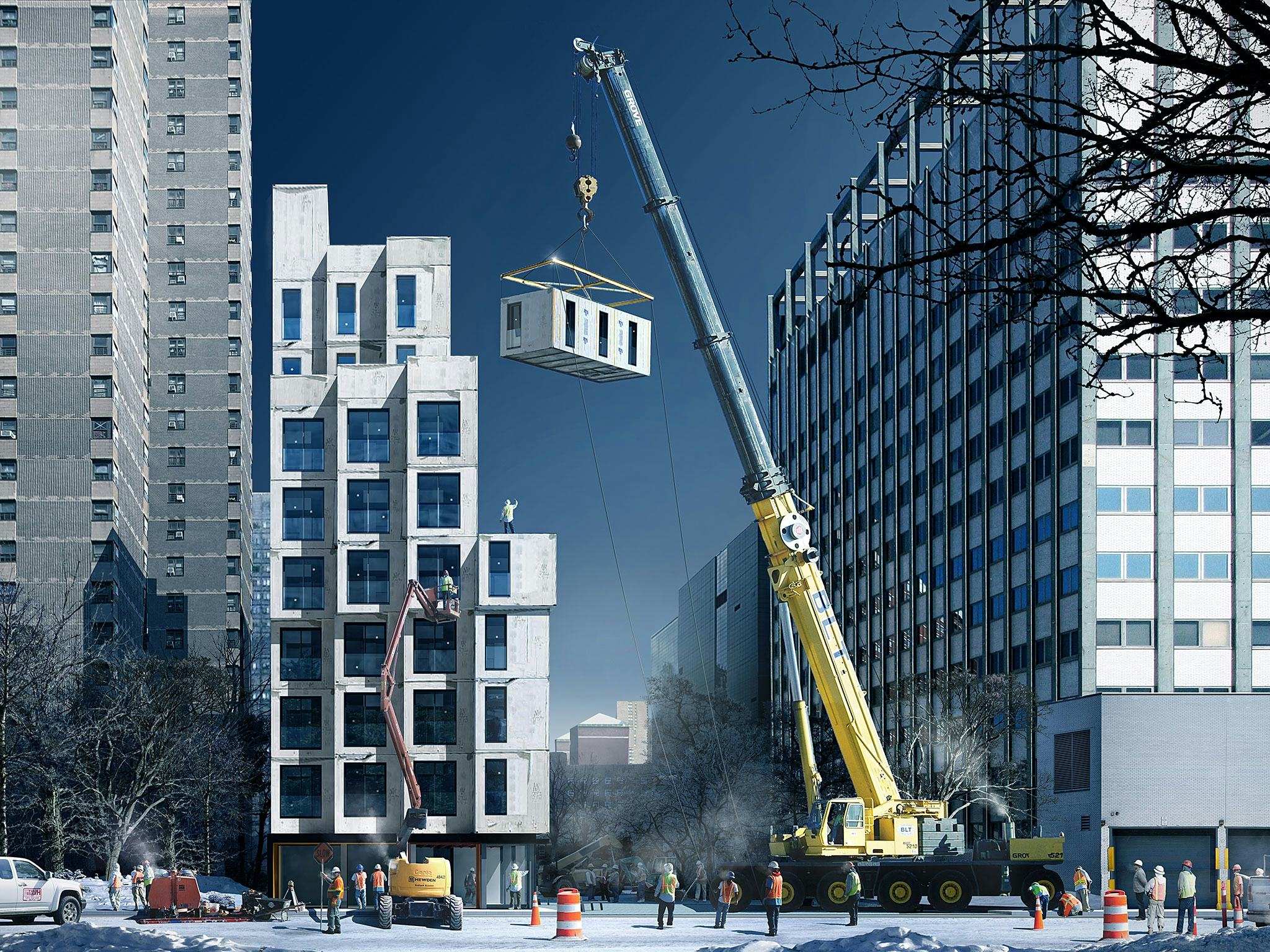 De stad New York laat op Manhattan een negen etages hoog complex bouwen dat is samengesteld uit 55 geprefabriceerde micro-appartementen.