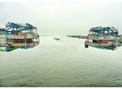 Het is een bijna fantasy-achtig tafereel: als je vanuit je ooghoeken kijkt, lijken het de bekken van twee blauwe monsters die hun grijze prooi besluipen.