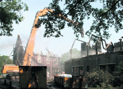 Onder strenge veiligheidsmaatregelen, verborgen achter met zwart plastic afgeplakte hoge hekken, is Heezen Sloopwerken uit Eindhoven bezig met de gedeeltelijke sloop van het monumentale stuk en de nieuwbouw van het gemeentehuis in Waalre, dat onlangs afbrandde. Vanwege de cultuurhistorische waarde is voorzichtigheid geboden.