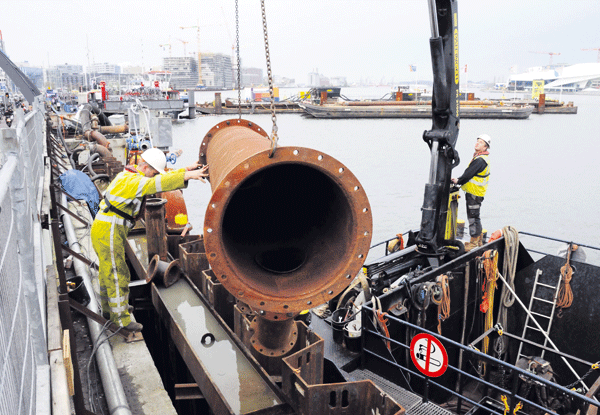Medewerkers van Van Oord CSO zijn bezig met de montage van een waterpomp.
