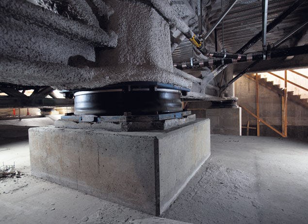 Na een aardbeving is het van levensbelang dat lokale ziekenhuizen in bedrijf blijven om gewonden op te vangen. In de kelder van het nieuwe Mills-Peninsula Medical Center in Burlingame, even buiten San Francisco, zitten daarom 176 trillingsisolatoren die het hele gebouw isoleren van aardschokken.