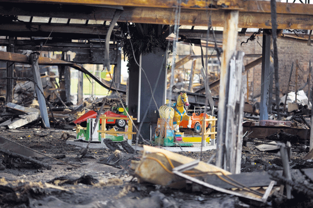 De kleine draaimolen is nog herkenbaar, maar de rest van het winkelcentrum van Stein met veertig winkels, twee bankgebouwen en negen woningen brandde eind vorige maand volledig af.