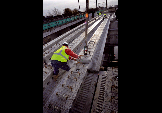Medewerkers van Lely 2009, een bouwcombinatie van MNO Vervat en Mobilis, plaatsen betonnen liggers voor een nieuw spoorviaduct.