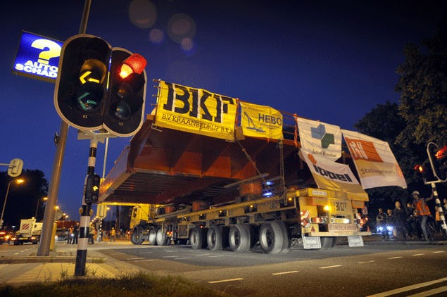 Tientallen verkeerslichten en lantaarnpalen moesten maandagnacht wijken voor het vervoer van de 40 ton zware val (het wegdek) en de 110 ton zware balans voor de Utrechtse 'rode brug'.