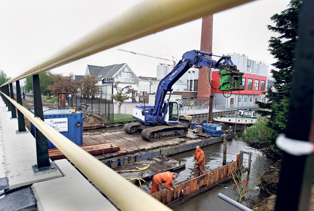 In het kader van het Friese Merenproject van Provincie Fryslân leggen medewerkers van Leemburg waterbouw/oeverwerken de laatste hand aan de walbeschoeiing langs de oever van de nieuwe brug.
