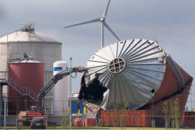 Werknemers van sloopbedrijf Van der Laan Sloopwerken slopen op het terrein van BioValue een opslagtank met een diameter van 13 meter en een hoogte van 16 meter.