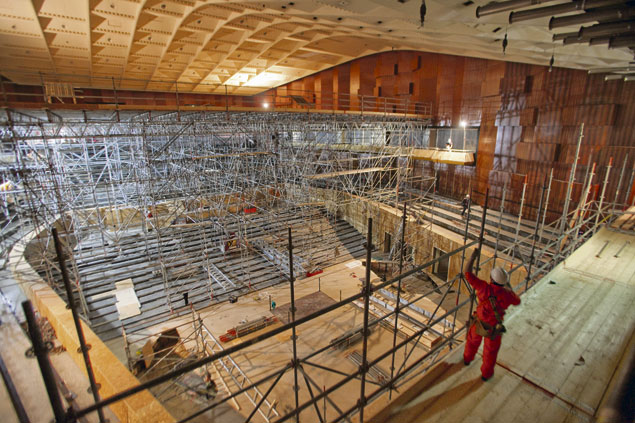 Werknemers van Steigerbouw Van Der Panne Rotterdam zijn bezig met het monteren van circa 170 ton aan steigermaterialen in de grote zaal van het Rotterdamse concertgebouw De Doelen.