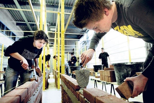 Behoedzaam roert Jerre de Feijter, student aan de Technische Universiteit Eindhoven, zijn troffel door een pak specie. Voor het eerst in zijn leven metselt hij een muurtje.