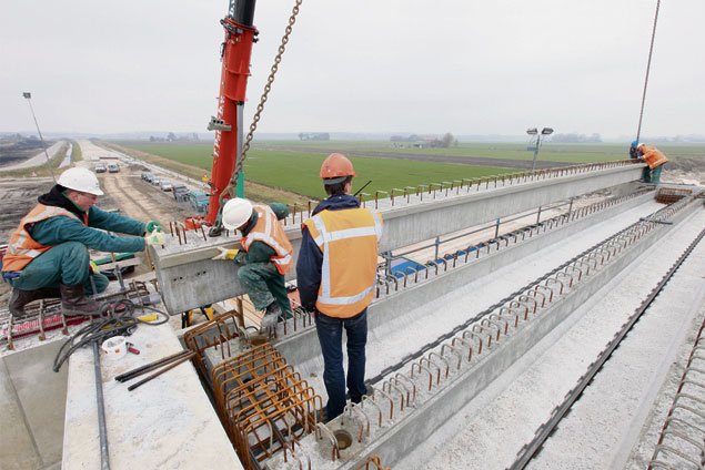 Medewerkers van Ballast Nedam en Haitsma zijn in de weer met het plaatsen van acht liggers voor de bouw van een spoorviaduct zo'n 800 meter voor de tunnel onder het Drontermeer.
