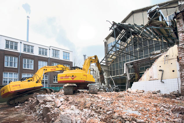 Medewerkers van Van Vliet Sloopwerken zijn bezig met de sloop van de voormalige Calvé-fabriek in Delft.