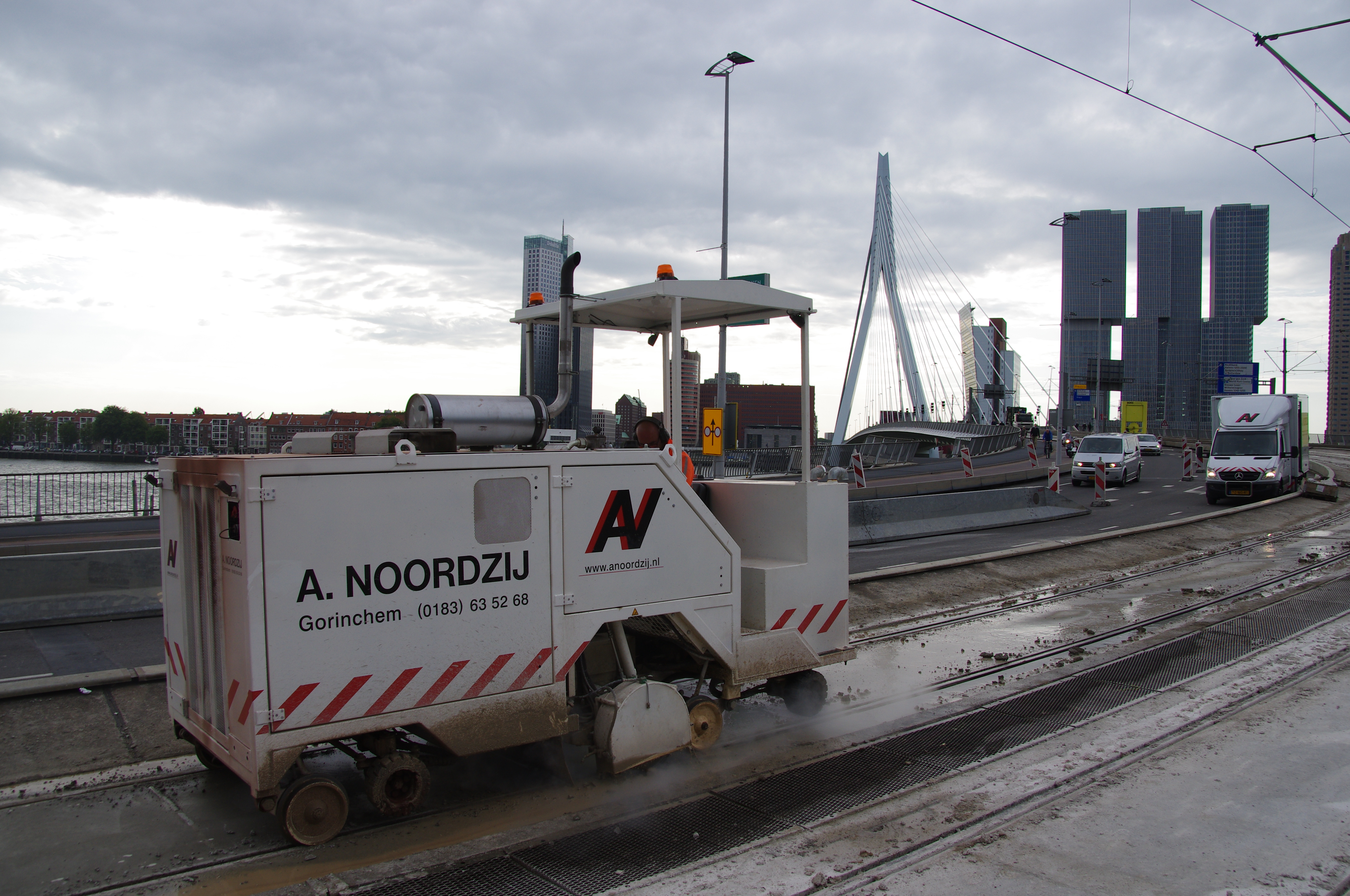 De XL Lezersfoto van vandaag is ingestuurd door Jos Noordzij van Noordzij Bitumenverwerking. In opdracht van de RET werken zij samen met hoofdaannemer W v/d Heuvel & Zn Infra uit Rhoon aan het vervangen van de tramrails op de Rotterdamse Erasmusbrug.