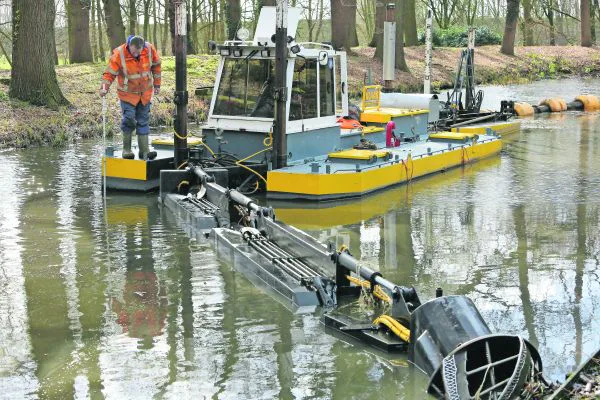 Medewerkers van Klaar Baggertechnieken uit Brummen baggeren met een speciale boot de buitengracht van kasteel Middachten in De Steeg bij Arnhem. De bijzondere gracht is voor zover bekend nog nooit eerder uitgebaggerd.