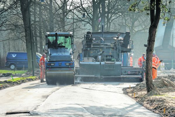 Asfalteerders van Verhoef Infra uit Europoort maken de toerit naar woningen die op het oostelijke deel van landgoed Duin en Bosch worden gebouwd.