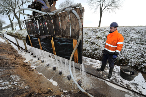 Met elf spuitlansen op een stalen blad zet Sietse Gregardus een schot voor de nieuwe walbeschoeiing op zijn plek. Grondverzetbedrijf Van der Meer in Scharnegoutum heeft een manier ontwikkeld waarmee op walkanten met instabiel loopzand snel kan worden gewerkt. De oevers rond Steenwijk leverden het waterschap Reest en Wieden problemen op.