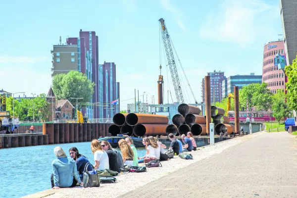 Studenten van de Haagse Hogeschool zitten ontspannen op de Neherkade in Den Haag, terwijl op de achtergrond wordt gezorgd voor een betere doorstroming van het verkeer.
