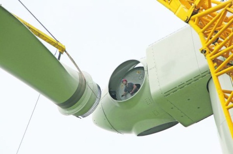 Langs de A15 ter hoogte van Lienden zijn de bladen van de laatste van vier windturbines geplaatst. In de loop van komende week komen de 90 meter hoge windmolens (met de wieken erbij gerekend 135 meter), met een gewicht van 100 ton per stuk, in bedrijf.