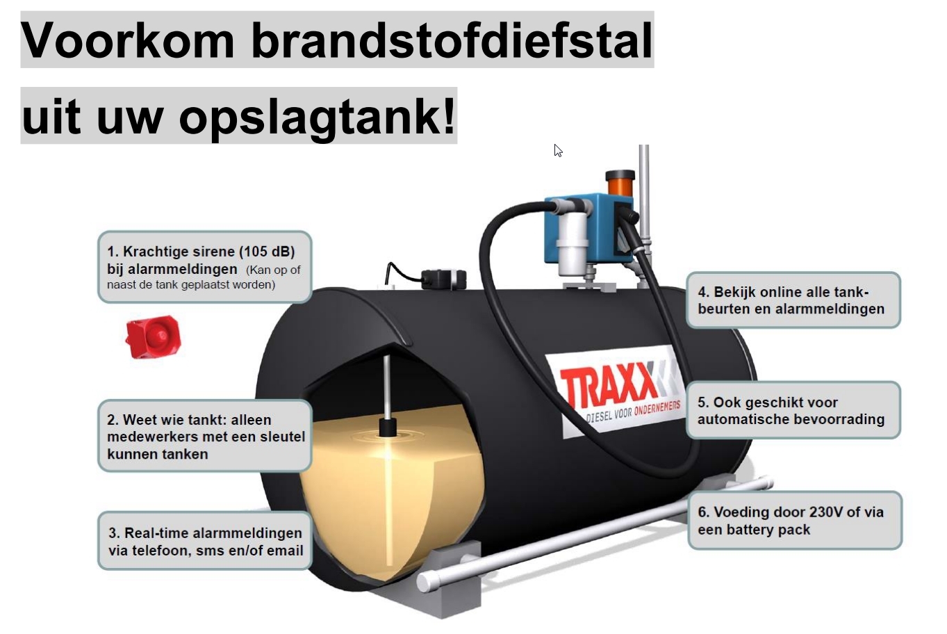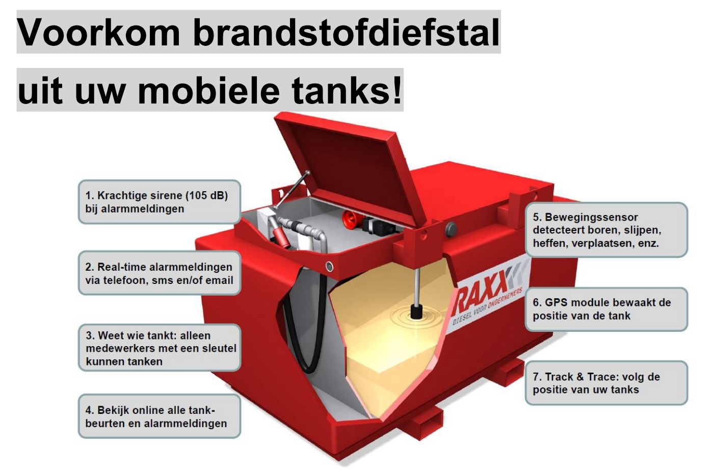 Brandstofleverancier Traxx en telemetriespecialist Mobifox hebben een vijftal Brandstof Alarm Systemen ontwikkeld voor vaste en voor mobiele brandstoftanks. Brandstofdiefstal neemt namelijk schrikbarende vormen aan sinds de rode diesel is afgeschaft.