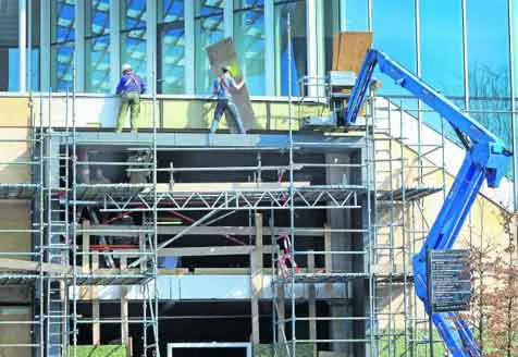 Medewerkers van ITH Techniek uit Kerkrade leggen de laatste hand aan de gevel van Primark Venlo. De kledingwinkel komt onder Theater De Maaspoort.