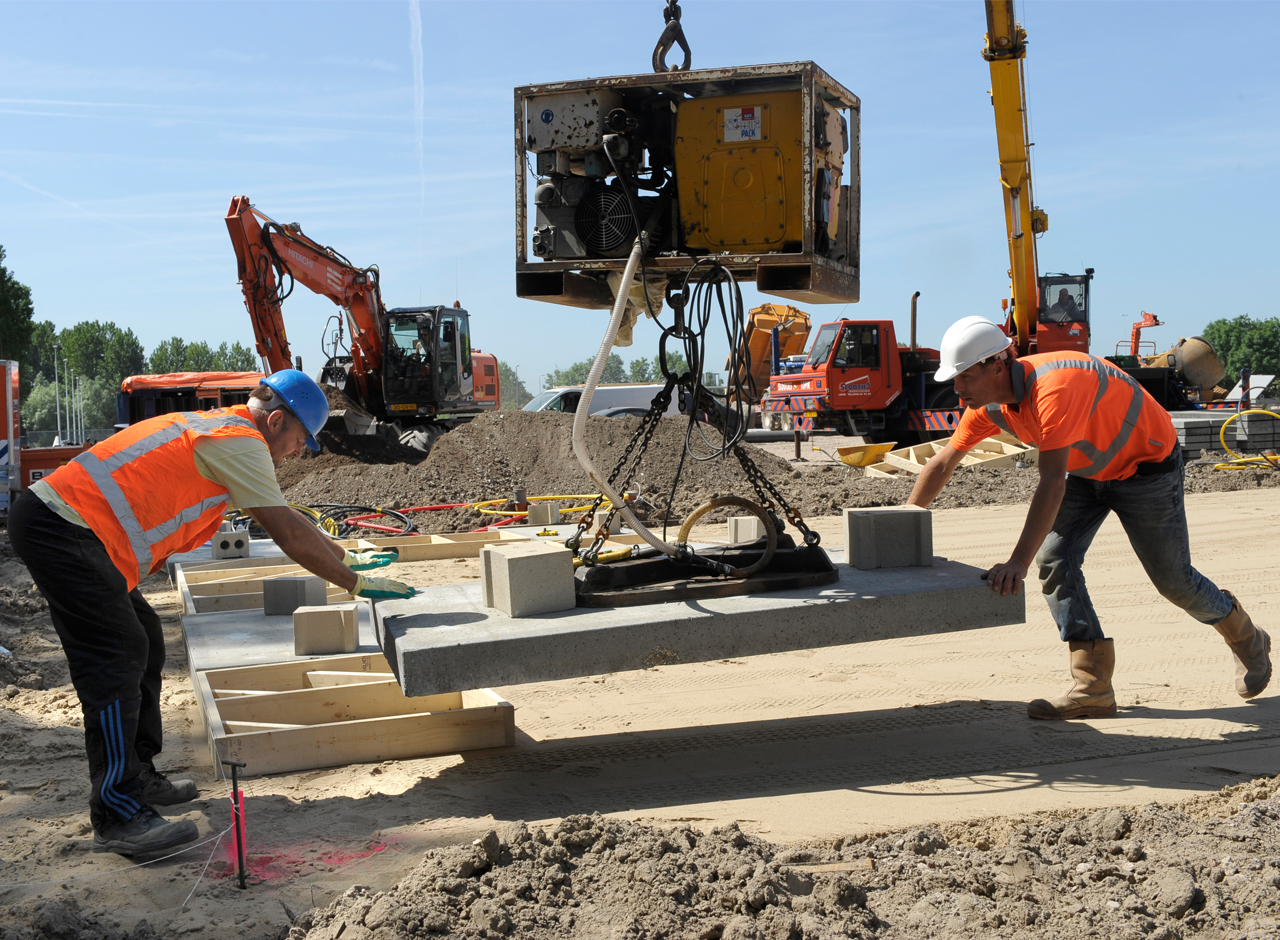 Medewerkers van Rasenberg Infra uit Breda zijn druk bezig met de aanleg van de fundering voor nieuwe AZC-containerwoningen in het gebied Ijsselmonde in Rotterdam. Op de funderingslaag is een geëgaliseerde zandlaag aangebracht. Met behulp van een hijskraan sturen de medewerkers betonnen Stelcon platen naar hun plaats. De houten afstandhouders helpen de positie van de platen te bepalen. Op de betonnen ondergrond worden de tijdelijke containerwoningen geplaatst. Er is plaats voor maximaal zeshonderd mensen. Het asielzoekerscentrum blijft voor een periode van vijf jaar staan.