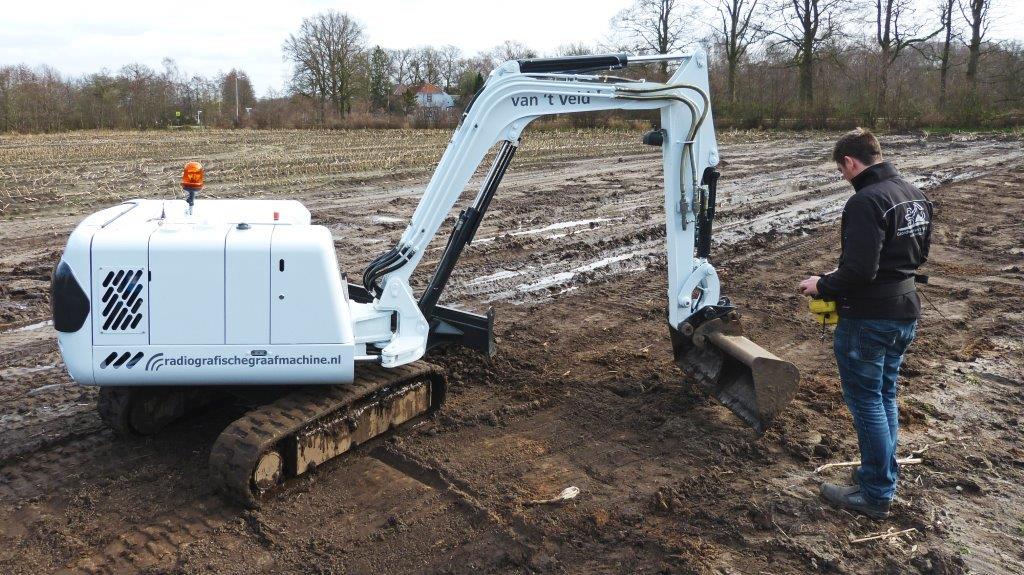 Grondwerken Van 't Veld uit Putten heeft een radiografische minigraver op rups ontwikkeld. Na anderhalfjaar experimenteren en bouwen is deze 'Radiograver' klaar voor het grote werk. De voordelen zijn legio, zowel waar het de personele inzet betreft als veiligheid.