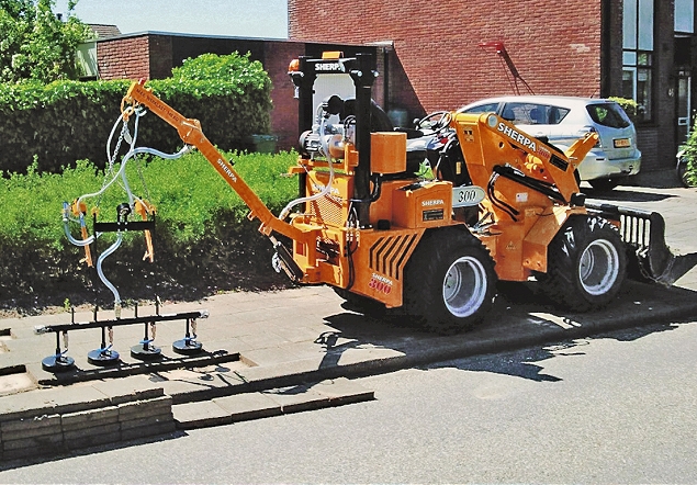 Sherpa miniloaders presenteerde tijdens de Infra Relatiedagen in Hardenberg haar nieuwe type hydraulische bandensteller. Die is gemonteerd achterop de Sherpa 300+ en maakt het snel wisselen van werkzaamheden mogelijk.