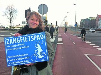 Driekwart van de fietsers zingt graag onderweg, maar zo gauw hij of zij een ander ziet, stopt het gezang. Uitzonderingen daargelaten. De reden: schaamte. Doodzonde, vindt kunstenares Mapije de Wit, want zingen maakt vrolijk. Zij bedacht het Zangfietspad en ontwierp een verkeersbord.