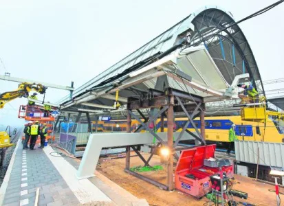 Op het tweede perron van station Zwolle plaatsen medewerkers van aannemingsbedrijf K. Dekker in opdracht van ProRail een definitieve ondersteuningsbalk voor de poot van de grote koepelperronkap.
