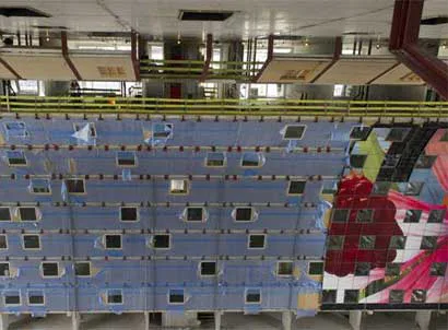 Op de vloer van Markthal Rotterdam werken monteurs aan een enorme legpuzzel. De in totaal 4350 unieke panelen waarmee de binnenzijde van de boog wordt bekleed, vormen samen een kleurrijk kunstwerk.