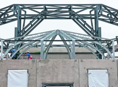 Werknemers van aannemingsbedrijf P. Meijer uit Beverwijk werken in opdracht van de Turkse moskeevereniging Aya Sofia aan het skelet van de Westermoskee in Amsterdam-West.