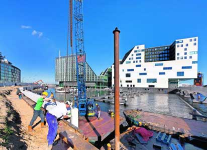 Werknemers van aannemingsbedrijf Dekker uit Krabbendam plaatsen tegenover het IJdock de betonnen elementen van een nieuwe kaderand. De openbare ruimte op het Westerdokseiland krijgt een heel ander aanzien.