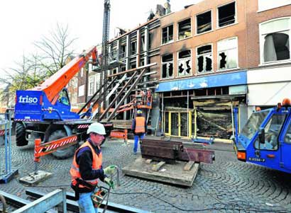 Met man en macht heeft Friso Bouwgroep gewerkt aan het stutten van de voorgevel van het pand in de Leeuwarder binnenstad, waarbij vorige week zondag tijdens een brand een student om het leven kwam. De zware storm van gisteren maakte het noodzakelijk om de muur te borgen. Onderzoek naar de oorzaak van de brand, waarbij