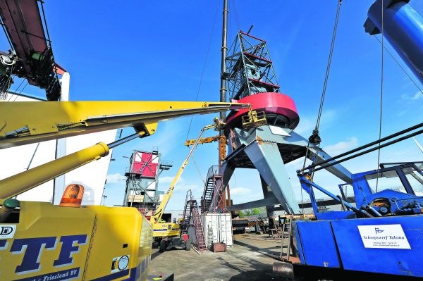 De 'hotelkraan' voor het Amsterdamse IJ is in het weekeinde in Franeker voor transport op een ponton getakeld.