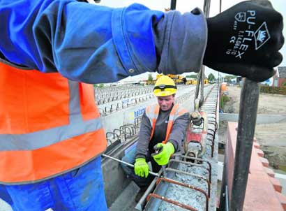 Een brug op het droge. Medewerkers van Sarin in Dordrecht maken de laatste randbalk vast aan een ligger. Daarmee voorkomen zij dat de balk tijdens het storten van beton voor het brugdek naar buiten wordt gedrukt.