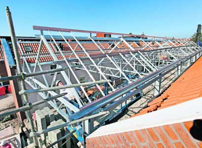In het weiland, midden tussen de koeien, bouwt Van den Brink Montage uit Kootwijkerbroek een extra stal voor veehouder Roordink in Molenhoek. Van den Brink zet de stal, die 19 meter breed en 28 meer lang is, in slechts een week tijd neer. Het bouwwerk bestaat uit een staalconstructie met daartussen metselwanden. De kap van