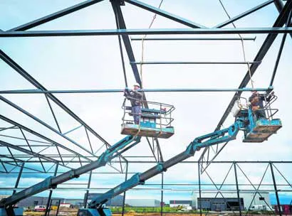 Langs de A28 bij Staphorst verrijst de staalconstructie voor het nieuwe bedrijfspand van Brink Climate Systems. Vanuit hun hoogwerkers reiken medewerkers van Van den Brink Staalbouw uit Barneveld tot aan de stalen spanten.