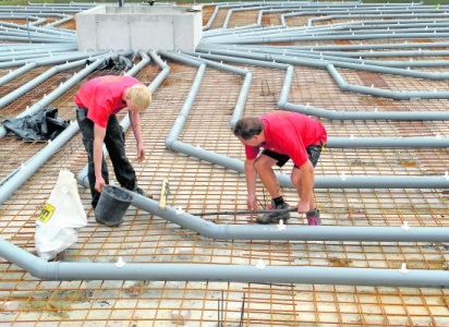 Medewerkers van aannemersbedrijf D. Kroese uit Vinkeveen zijn bezig met het waterpas stellen van luchtbuizen voor de in aanbouw zijnde koeienstal van bioboer Albert Blommestijn uit De Kwakel (Noord-Holland).