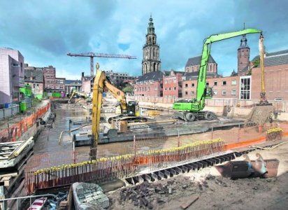 In de Groninger binnenstad baggeren kranen op pontons slib, klei en modder uit de grond op de plek waar BAM het Groninger Forum gaat bouwen.