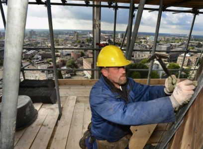 De toren van de St. Jozefkerk (1893) in Enschede wordt flink onder handen genomen. Aannemer Löwik uit Almelo verricht een scala aan werkzaamheden.