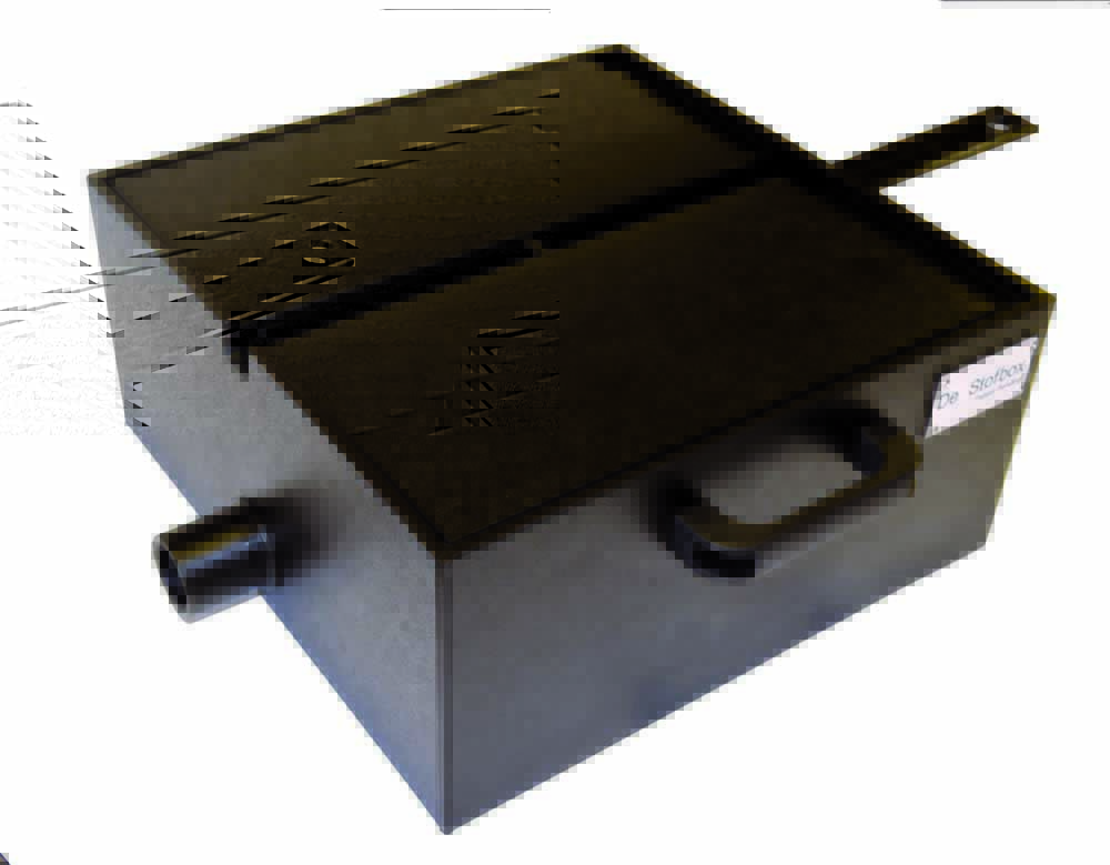 Een opvangbox met stofafzuiging voert steenstof af tijdens het bewerken van tegels