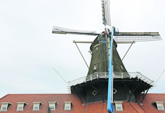 Door de droge zomer kregen de houten latten in de wieken van molen De Zwaluw in Kesteren te veel speling en gingen zij rammelen. Molenmaker Wim van der Wal uit Alblasserdam verhelpt het euvel.